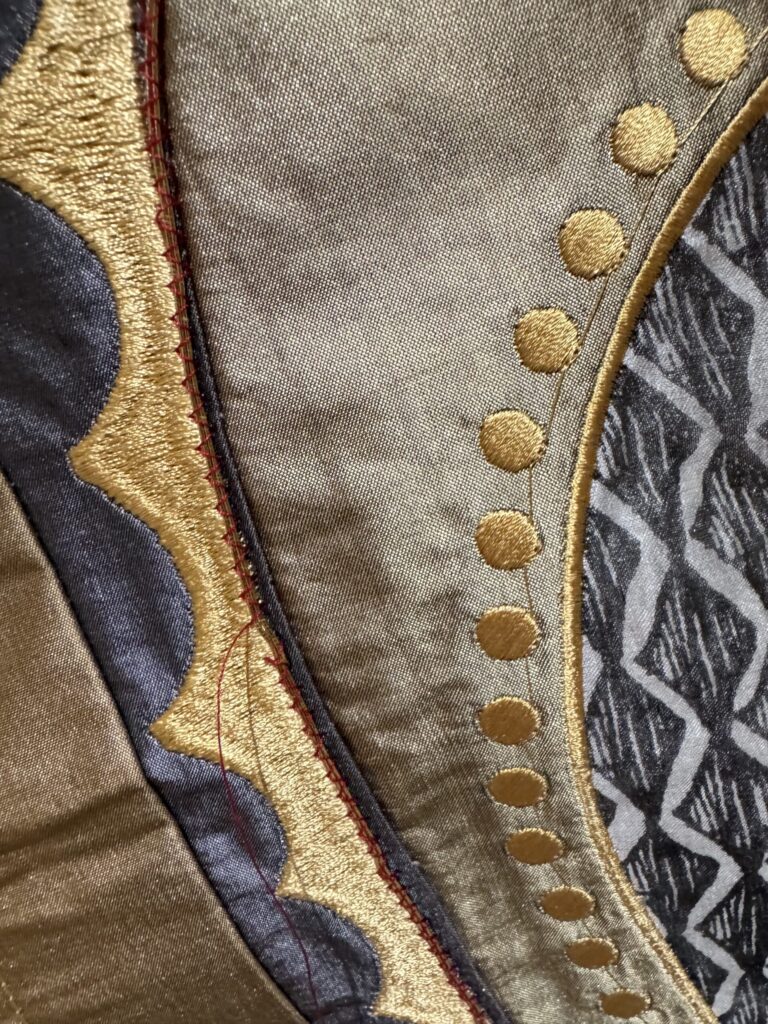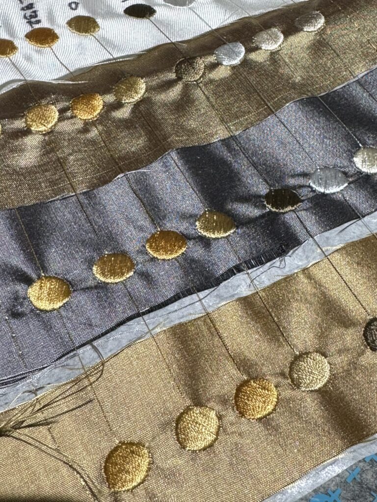This was not about speed or efficiency, although I knew I didnt have time for handwork at this scale. It was about control, density, layering, and finish. Machine embroidery can easily become flat, harsh, or overly regular if treated casually. To avoid that, I spent significant time developing designs and stitch structures that created depth, clarity, and softness—qualities traditionally associated with handwork.