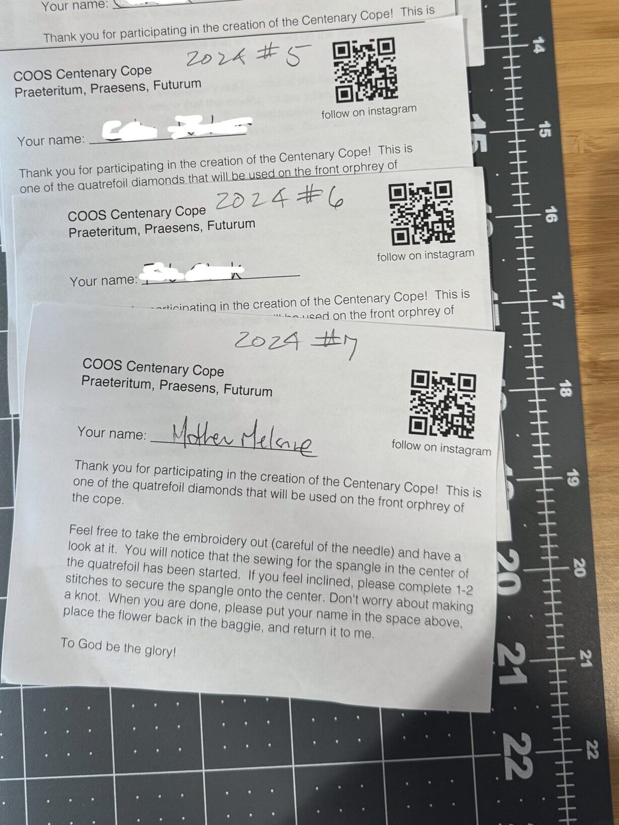 The cards, each bearing the name of the person who completed the kit, became a quiet record of participation documented in the cope’s provenance. Together they tell a parallel story to the embroidery itself.