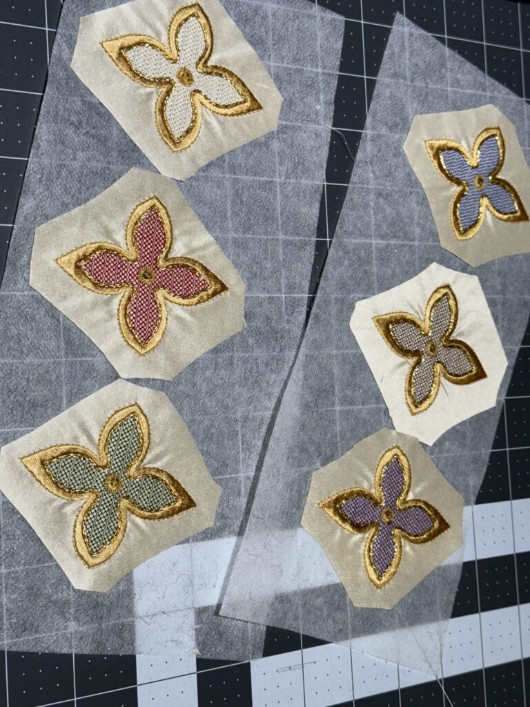 Every diamond and flower was fully stitched by me before it ever left the studio. The embroidery, padding, and couched gold threads were complete. The only remaining step was attaching the spangle at the center—an element that carries both visual and symbolic weight.